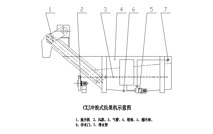 该机由机架、水箱、风机、提升机、气泡管、喷水管等几部分组成,工作时由于水中风力的存在,蔬果在水中任意方向翻滚转动,并在高压水力的推动下向前移动,在出口由一刮板提升机,将蜜桃视频APP网站送至下道工序。整体为分体式结构,水箱与输送机、进出料斗、罩板方便拆卸,易于清洗和检修。
