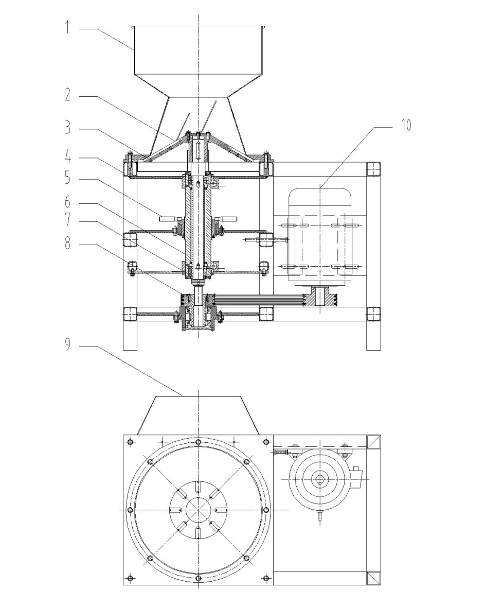 1、进料斗;2、齿刀片;3、刀盘;4、机架;5、转子升降机构;6、轴承架;7、轴承;8、皮带传动机构;9、出料斗;10、电机